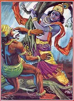 Pleased with his help during the battle with Ravana, Lord Rama granted Jambavanta a wish. Jambavantha then expressed his wish to fight Lord Rama in a duel. Lord Rama said he would definitely fight him but not as Rama. Later in Dwapara yuga, Krishna fought Jambavanta in a duel and defeated him. Jambavantha then realized that it was Lord Rama who in Krishna's form defeated him.